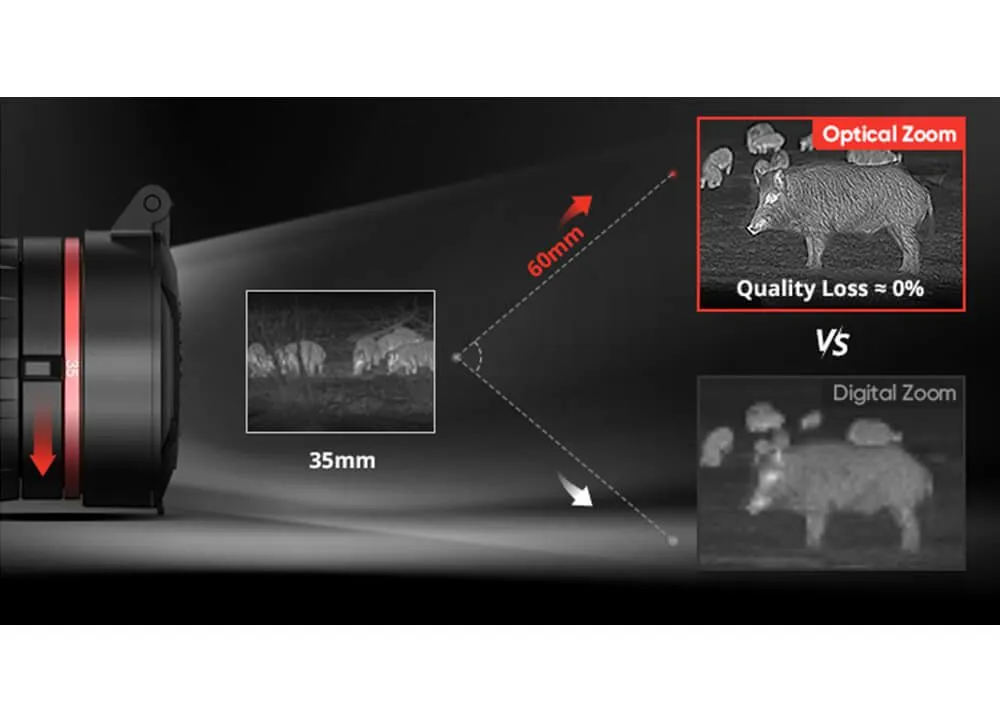 • Wszechstronność: Zmienna ogniskowa (35/60 mm) pozwala dostosować powiększenie do sytuacji – od bliskich strzałów po obserwację dalekich celów.