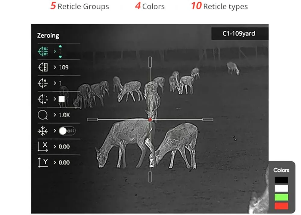 HikMicro Thunder 2.0 Zoom TQ60Z posiada w pełni regulowaną siatkę celowniczą, która pozwala użytkownikowi wybrać preferowany typ i kolor siatki, aby uzyskać najlepszy kontrast w danym środowisku. Można także zapisać wiele profili siatki, co ułatwia szybkie dostosowanie celownika do różnych warunków. Odległość od oka wynosząca 45 mm zapewnia komfortowe i bezpieczne użytkowanie.