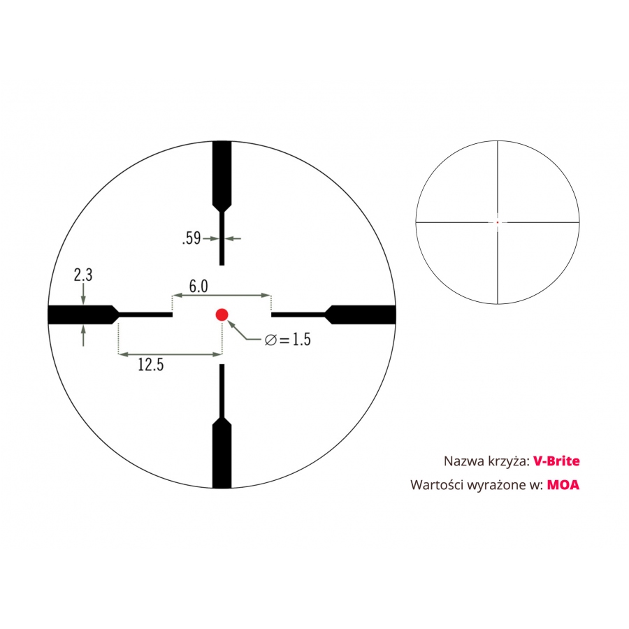 - Podświetlany krzyż V-Brite MOA poprawia kontrast celu.