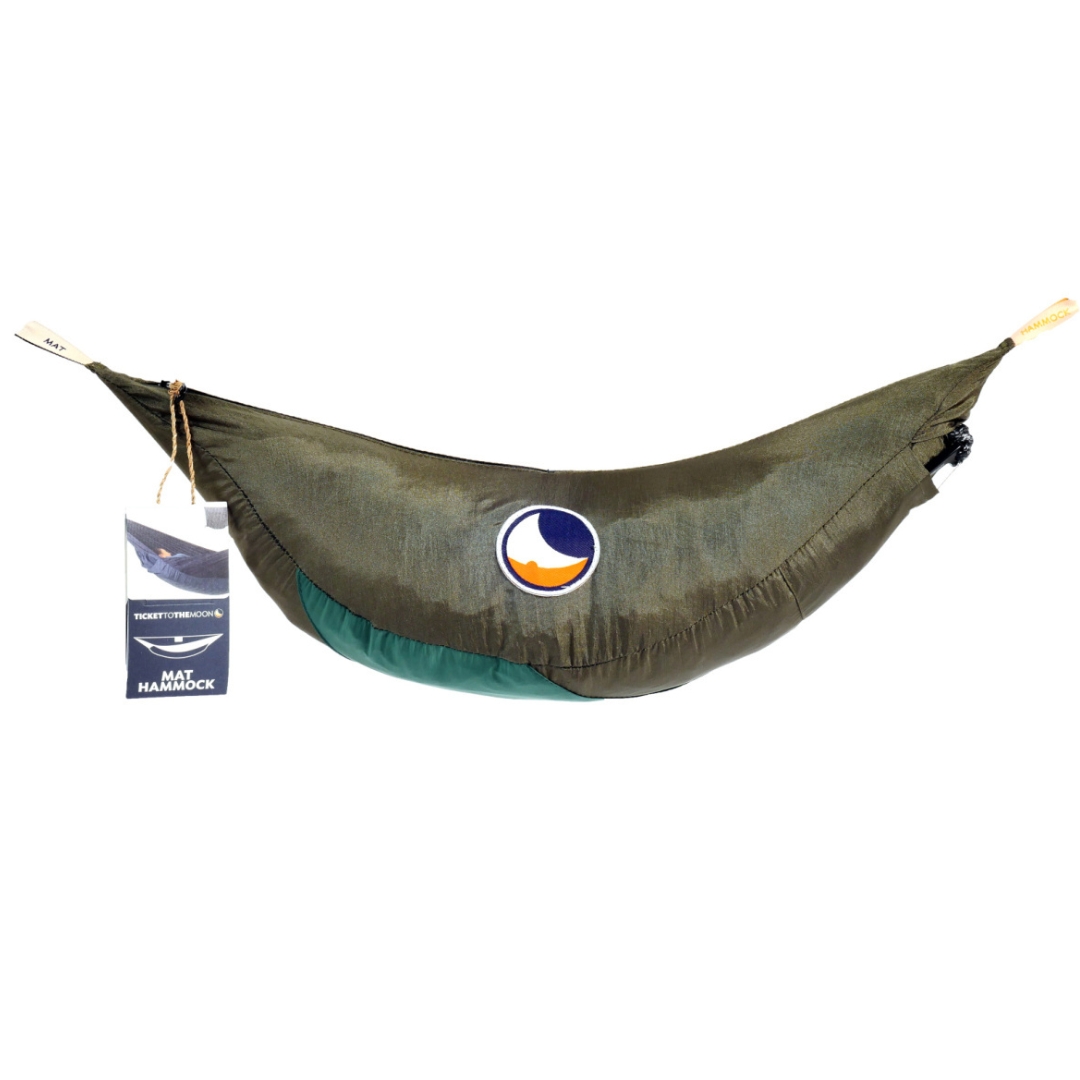 Mat Hammock Army Green ♻ to ekologiczna wersja klasycznego modelu Ticket To The Moon – wykonana z nylonu pochodzącego z recyklingu, z wbudowaną moskitierą i wygodnym systemem rozkładania. Kolorystyka army green świetnie wpisuje się w leśne i bushcraftowe klimaty, a przemyślana konstrukcja zapewnia pełną ochronę przed owadami i wysoki komfort użytkowania. To model stworzony z myślą o funkcjonalności, zrównoważonym podejściu i dostępnej cenie.