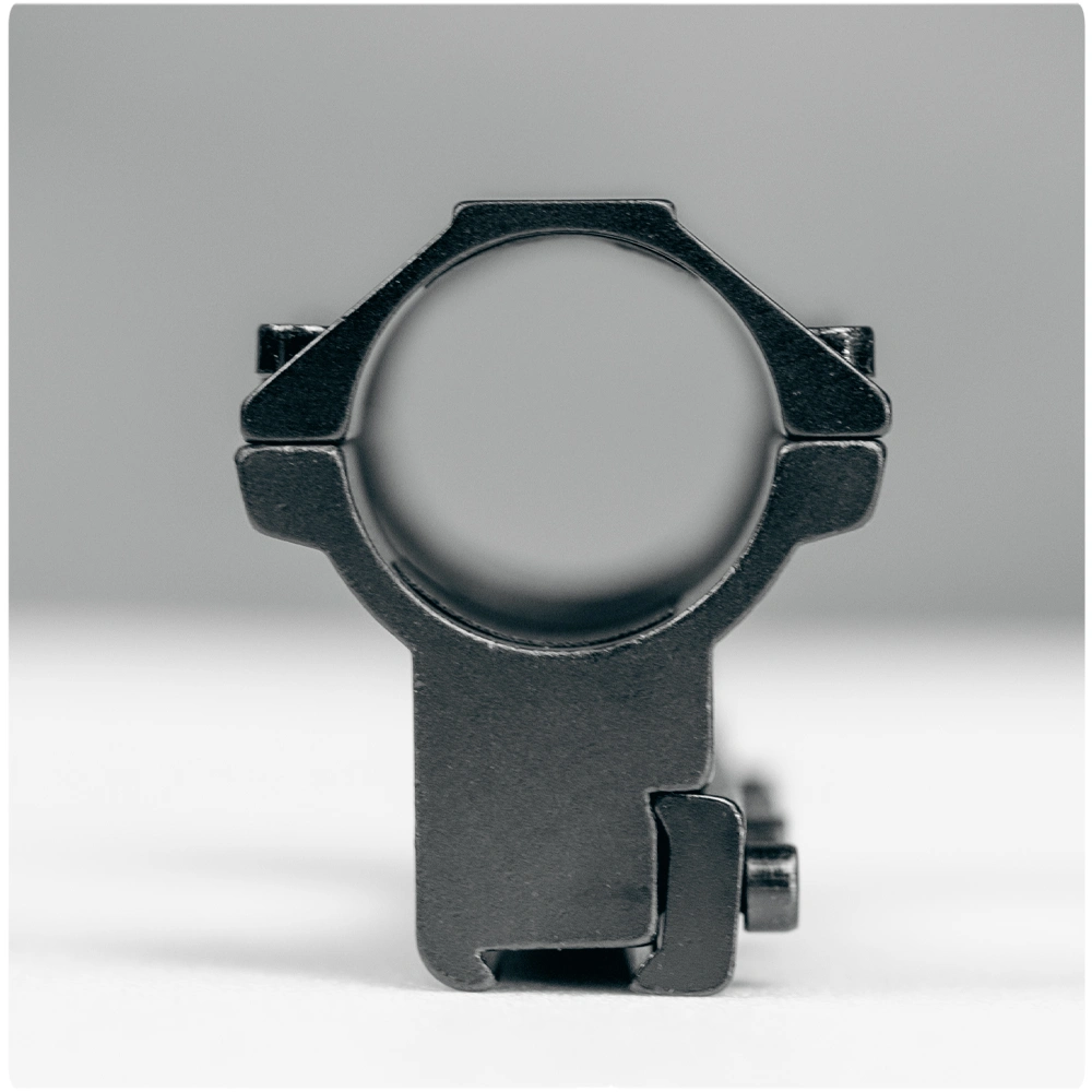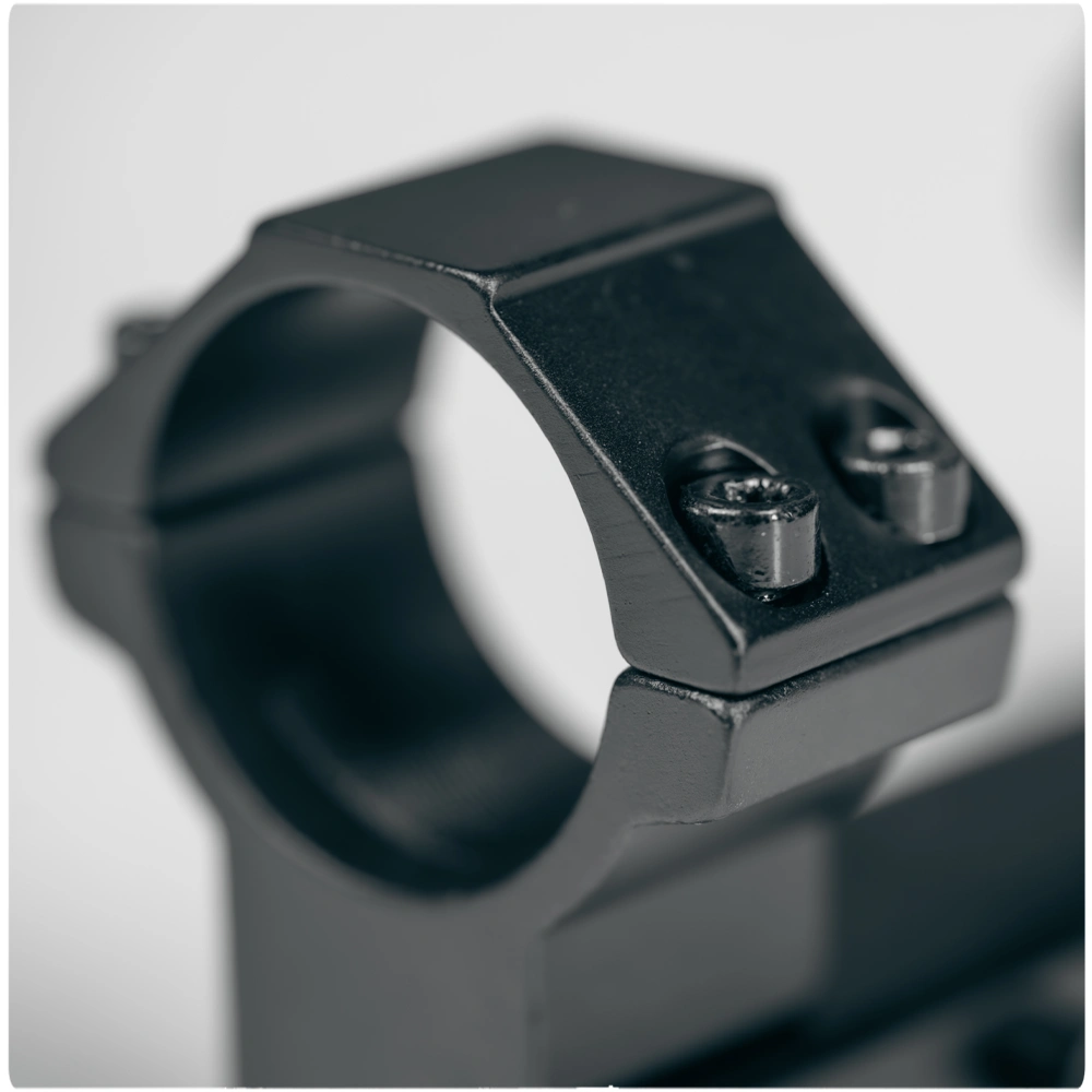 Montaż Panagas został zaprojektowany z myślą o maksymalnej trwałości i pewnym trzymaniu celownika. Mocowanie do szyny 11 mm realizowane jest za pomocą czterech śrub imbusowych, które gwarantują solidny chwyt bez luzów. Pierścień o średnicy 25,4 mm zaciskany jest dwiema śrubami imbusowymi z każdej strony, co pozwala równomiernie rozłożyć nacisk i utrzymać optykę w idealnym położeniu.