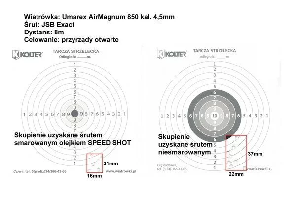 Olejek poprawia skupienie śrutu, szczególnie tańszych slugów (apollo) na ktorych wcześniej miałem kompletny siewnik. Wiadomo, że z oztaya nie zrobi exacta ale na pewno jest znacznie lepiej. Z tego co zauważyłem eliminuje też w moim karabinku tzw odskoki (trafienia położone znacznie dalej od głównej grupy trafień), które miały miejsce na tarczy co 3-6 strzałów. Nie testowałem olejku pod kątem przyrostu prędkości ale jest to uważam sprawa trzeciorzędna.