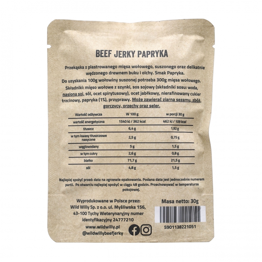 Wołowina suszona Wild Willy Papryka 30 g to aromatyczna przekąska typu beef jerky o delikatnie pikantnym smaku papryki. Naturalne składniki, tradycyjny proces suszenia oraz praktyczne opakowanie sprawiają, że produkt doskonale sprawdzi się podczas każdej aktywności w terenie.