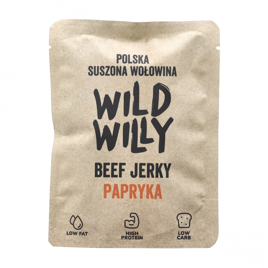 Wild Willy Beef Jerky Papryka 30 g to suszona wołowina stworzona z myślą o osobach aktywnie spędzających czas w terenie. Lekka, wysokobiałkowa przekąska sprawdzi się podczas wypraw outdoorowych, bushcraftu, survivalu czy podróży.